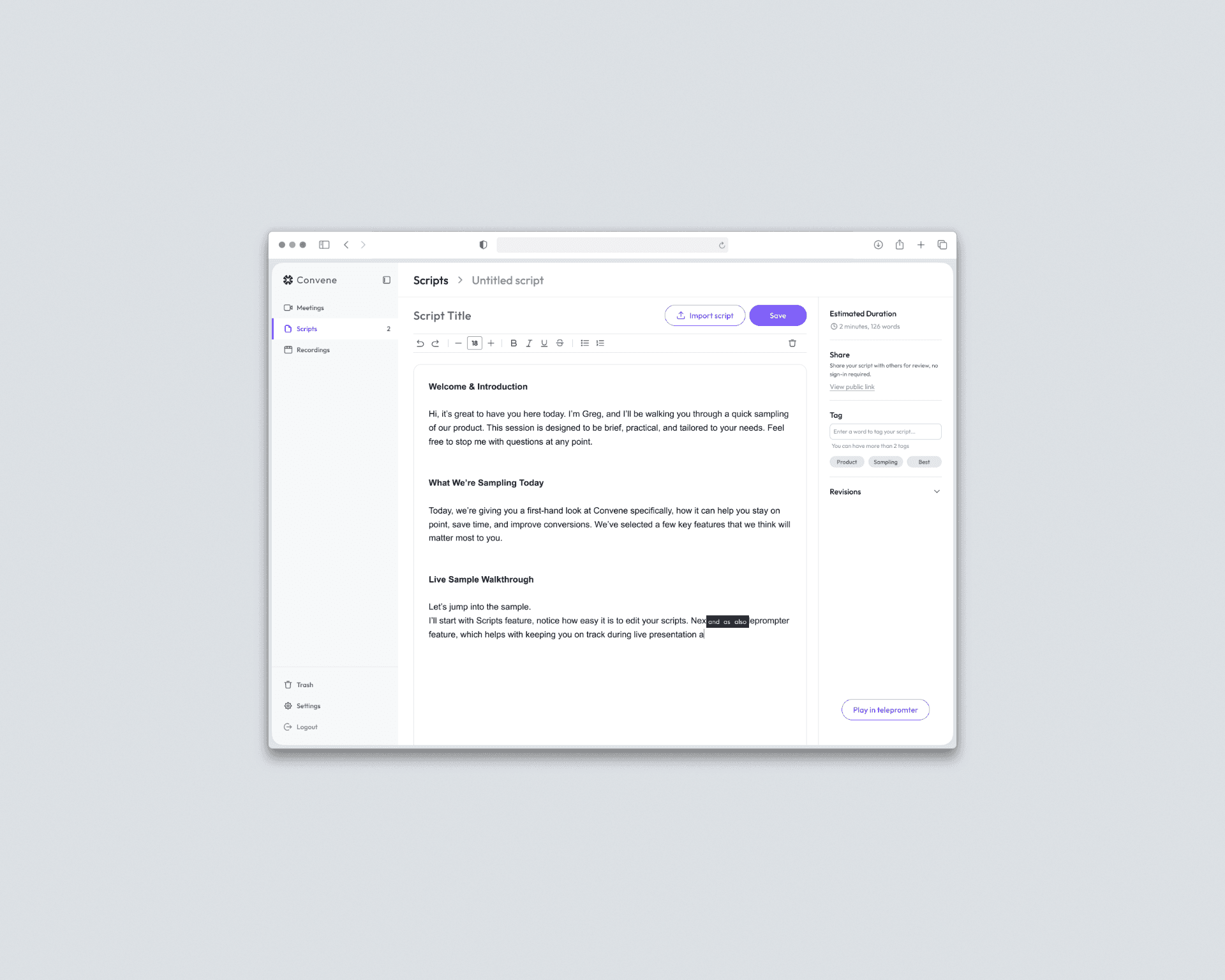 Design a seamless experience that brings scripts, teleprompter functionality, and video calls into one place, helping users stay confident, focused, and fully present during every meeting.